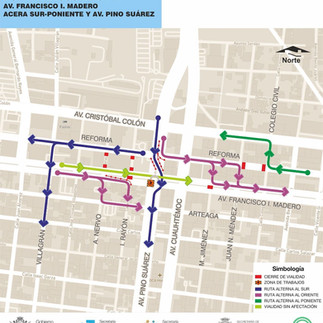 Quienes van por Madero, el carril norte continuará con su vialidad de manera normal, en cambio, para quienes transitan por el carril sur, debido a que los trabajos se desarrollarán en el cruce de Madero y Pino Suárez, se sugiere tomar las calles Amado Nervo o Rayón como alternativas viales.