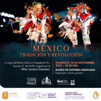 El Museo de Historia Mexicana se llena de color, música y orgullo nacional con la presentación del Ballet Folklórico Magisterial Nuevo León, Sección 21 del SNTE, bajo la dirección de la Mtra. Lorena Guerrero, con el espectáculo “México: Tradición y Revolución”, una celebración profunda y luminosa del nacionalismo mexicano, el domingo 16 de noviembre, a las 18:30 horas en la Explanada del Museo.